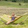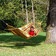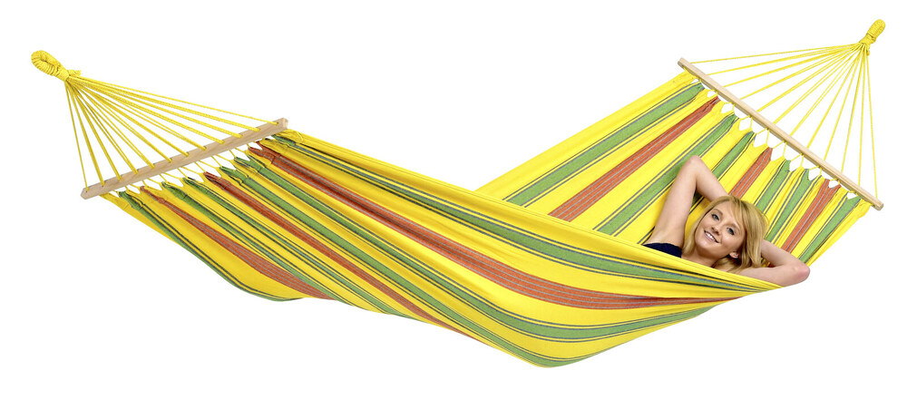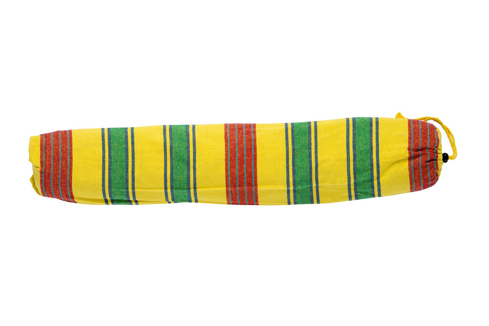 Egyszemélyes famaervítéses függőágy, nagyon vidám sárga csíkos színben, tárolózsákkal.
