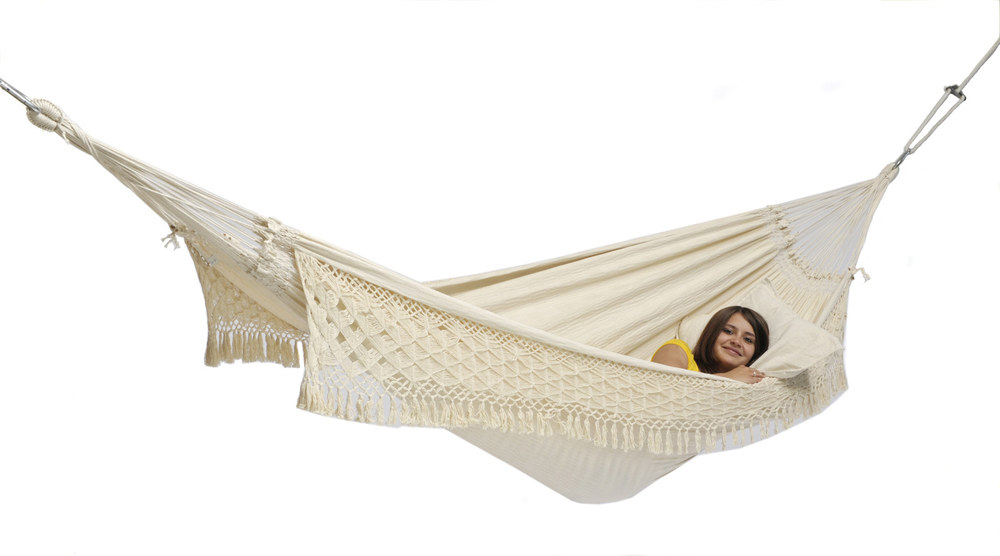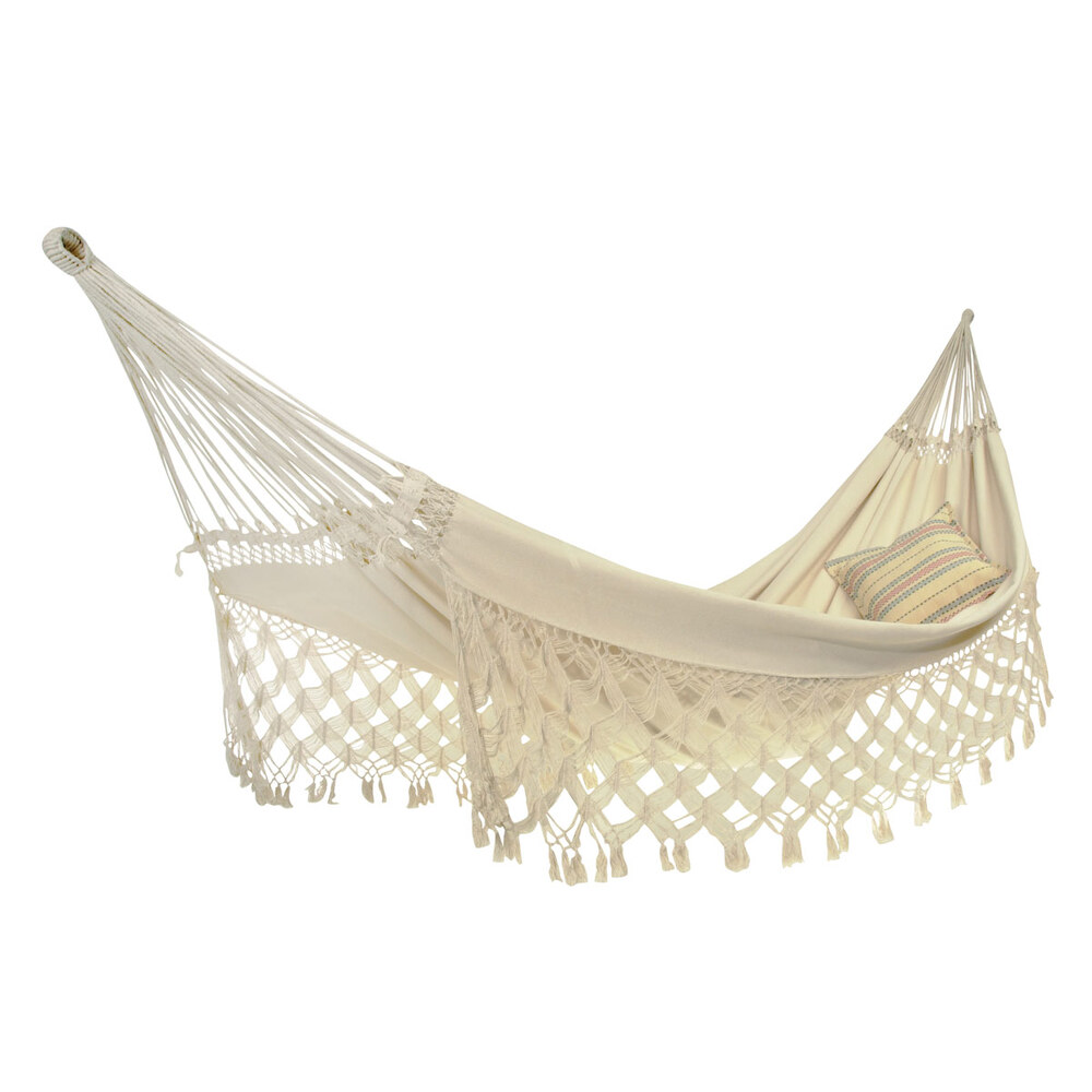 XXL makramé függőágy, kézzel készített rojtokkal.