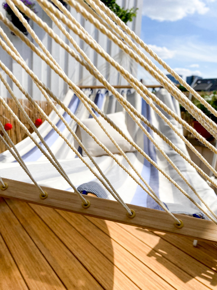 A La Siesta Alisio függőágy egész szezonban a szabadban hagyható! Az Alisio ugyanis HamacTex® polipropilénől készül. Ez az alapanyag ellenáll az időjárás viszontagságainak, gyorsan szárad, és mégis meglepően hasonló a pamuthoz – mind küllemre, mind pedig tapintását tekintve. A függőágy szakadásbiztos széleit egy speciális technikával, a vetülékfonalak duplázásával alakítják ki – így tulajdonosa hosszú évekig élvezheti a La Siesta Alisio által nyújtott békés oázis érzését.