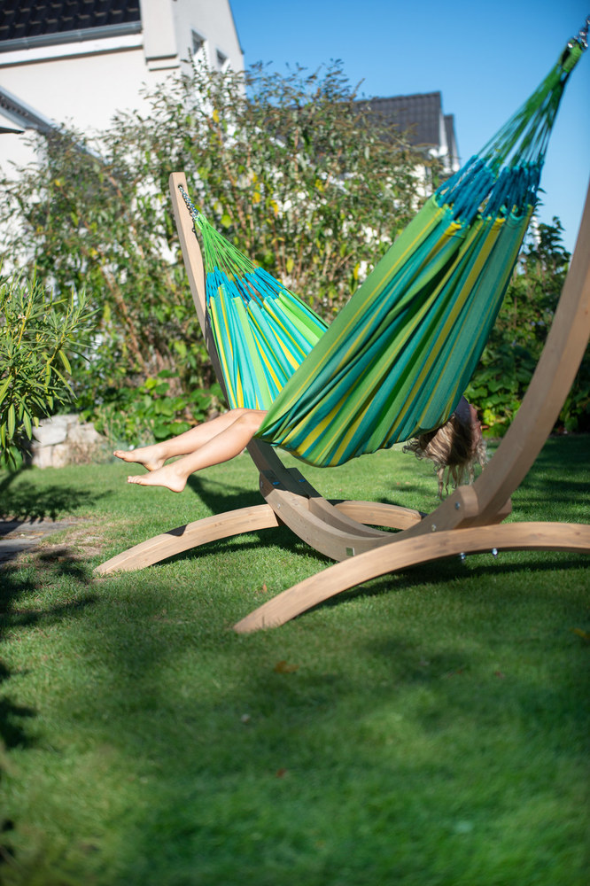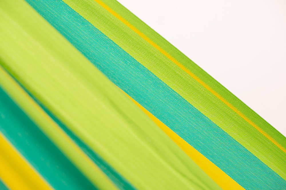 A La Siesta Brisa függőágy egész nyáron a szabadban hagyható! A Brisa ugyanis HamacTex® polipropilénől készül. Ez az alapanyag ellenáll az időjárás viszontagságainak, gyorsan szárad, és mégis meglepően hasonló a pamuthoz – mind küllemre, mind pedig tapintását tekintve. A függőágy szakadásbiztos széleit egy speciális technikával, a vetülékfonalak duplázásával alakítják ki – így tulajdonosa hosszú évekig élvezheti a La Siesta Brisa által nyújtott békés oázis érzését.