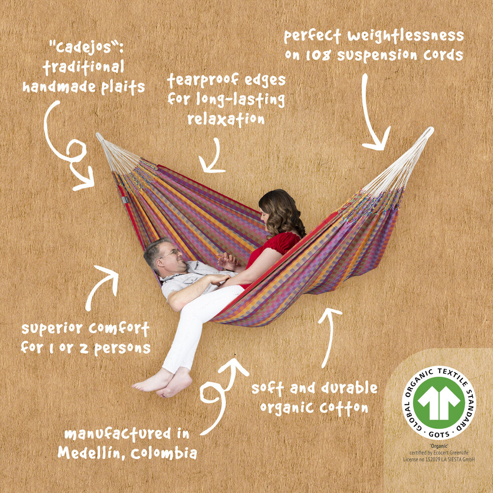 A Flora függőágy szálai 100% tiszta biopamutból készülnek, amit a hitelesített szerves művelés tesz lehetővé. Lélegzetelállítóan gyönyörű természetes színek, melyek tökéletesen illeszkednek életének hangulatához. Hatalmas méret az extra kényelemért.