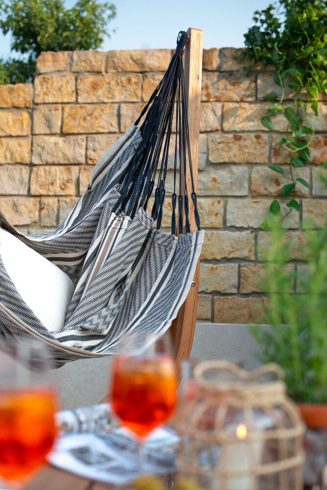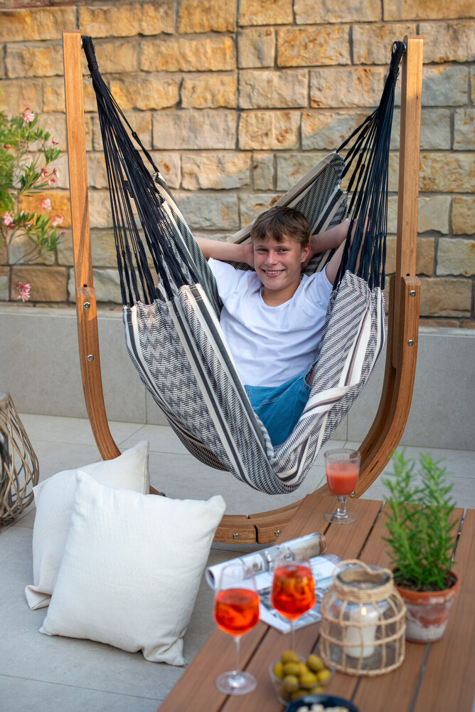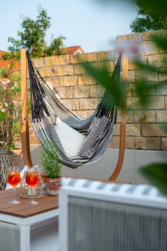 Az Udine állványt megvásárolhatod a Habana Blue Zebra Comfort függőfotel ülőfelületével együtt is. Ebben a szettben nincs benne a függőfotel merevítő rúdja és felső összekötő eleme, mert azok itt most feleslegesek. Így az ár is kedvezőbb, mint ha külön-külön vásárolnád meg őket.