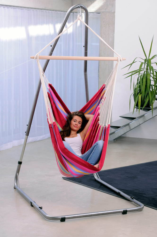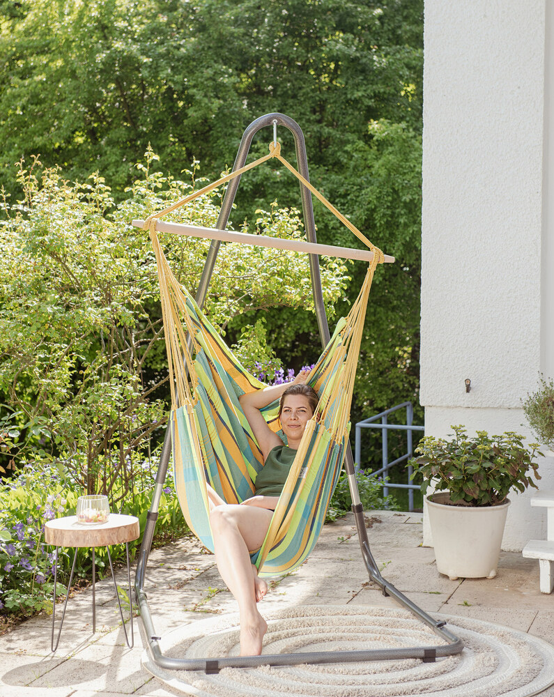 Ha a függőszék rögzítéséhez nem áll rendelkezésre sem fal, sem mennyezet, de egy árva faág sem, bátran válassza a stabil és elegáns Luna függőszék állványt. Így mindig kéznél lesz egy kényelmes kuckó, ahol az ember ringatózhat, álmodozhat, pihenhet. A Luna kiváló minőségű acélból készült, szerszám nélkül is könnyen összeszerelhető, minden függőszékhez ajánlott.