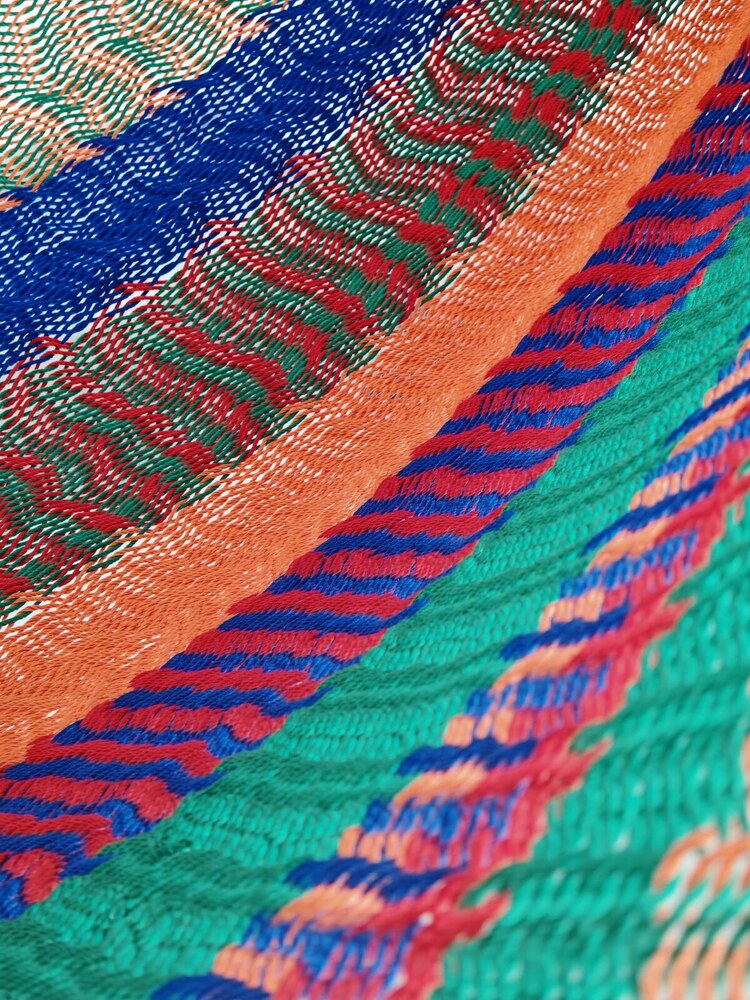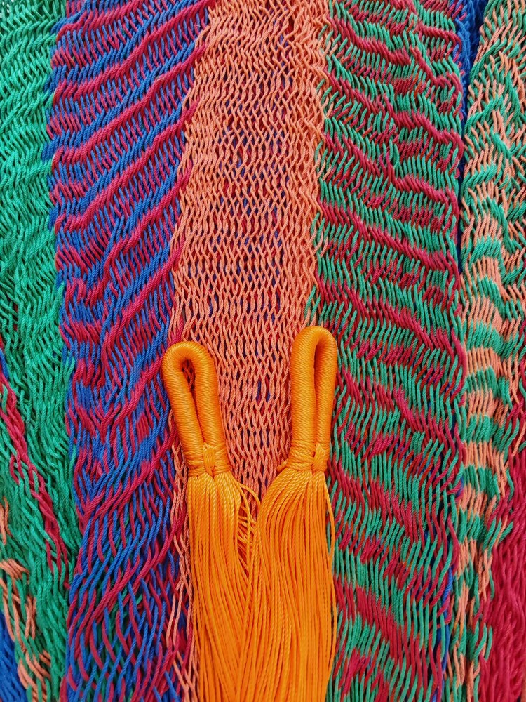 A hagyományos 'sprang' szövési technikának köszönhetően a függőágy tökéletesen felveszi a test alakját. A párhuzamos, de egymásba hurkolt szálak olyan felületet alkotnak, amely hosszanti irányban fix, keresztben rugalmas. A legnagyobb hőségben is szellős, kellemesen hűsít a szálak között átjáró levegő.