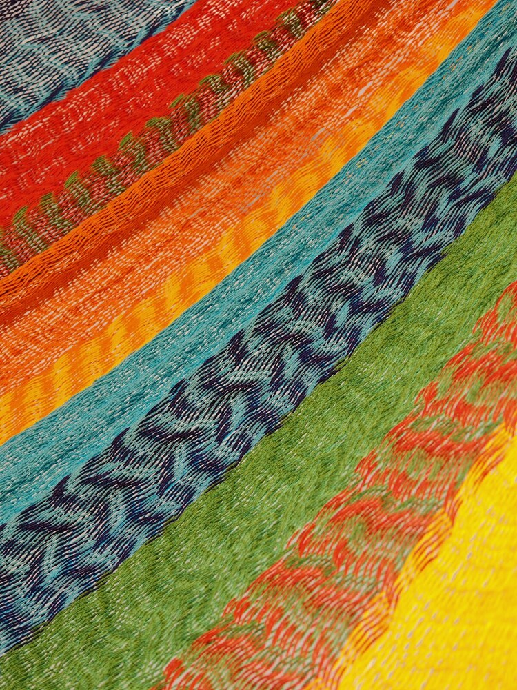 A hagyományos 'sprang' szövési technikának köszönhetően a függőágy tökéletesen felveszi a test alakját. A párhuzamos, de egymásba hurkolt szálak olyan felületet alkotnak, amely hosszanti irányban fix, keresztben rugalmas. A legnagyobb hőségben is szellős, kellemesen hűsít a szálak között átjáró levegő.