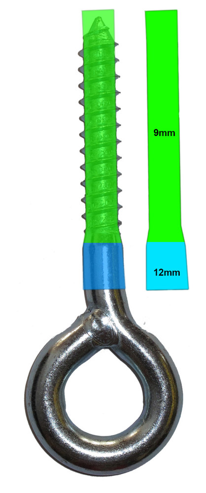 Ezt a csavart ajánljuk abban az esetben, ha fa gerendába vagy oszlopba kell rögzíteni a függőágyat és nem jó, ha hosszabb a csavar 10 centinél. (Nem is küldünk hozzá dübelt, mert a fához nem fog kelleni.) 9mm-es átmérőjű fúróval kell előfúrni, a lyuk első 30 milliméterén esetleg 12-essel, ez az anyagvastagság a szem előtt.