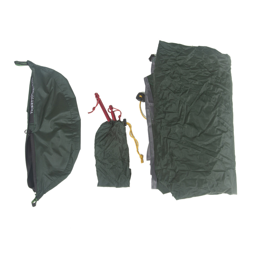A Sil-Nylon 20D ripstop anyagból készült tartós és vízálló anyag négy sarkán gyorskioldó csatok találhatók, további tartozék a két cövek és extra kifeszítő kötél, amik segítségével gyakorlatilag bárhol biztonságosan és stabilan felszerelhető a szett. További “extra”, hogy a ponyva négy sarkában minden kötél elfér, így tároláskor nem gubancolódnak össze.
