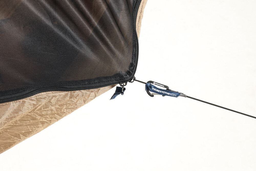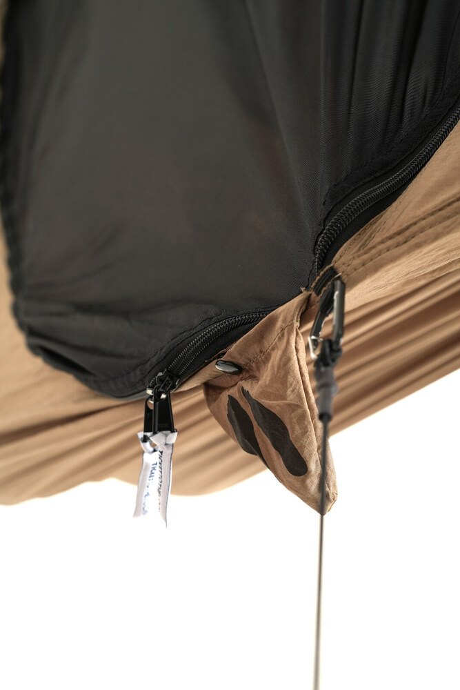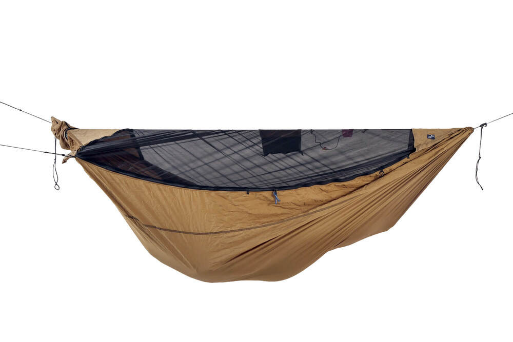 A legújabb a TTTM választékában a szúnyoghálóval egybeépített eredeti ejtőernyőselyemből készült túrafüggőágy. Könnyen használható megoldás a rovarvédelem mellett történő szabadban alváshoz. A kényelem és a funkcionalitás maximalizálva, a tömeg pedig minimalizálva.