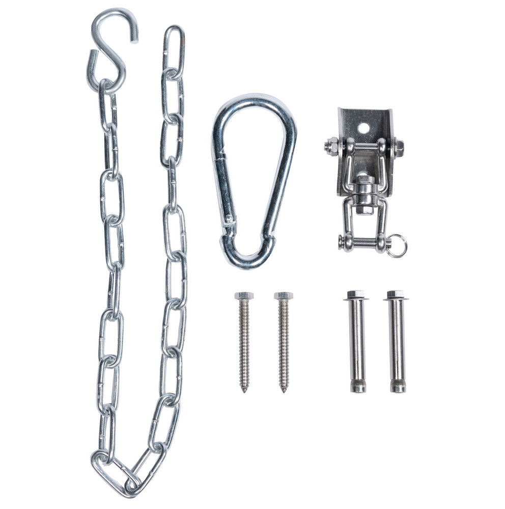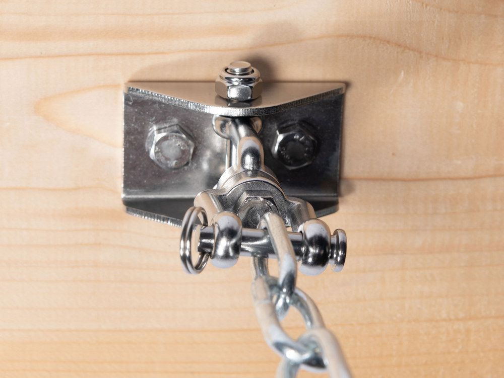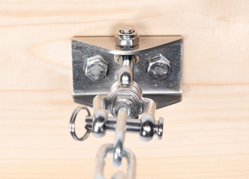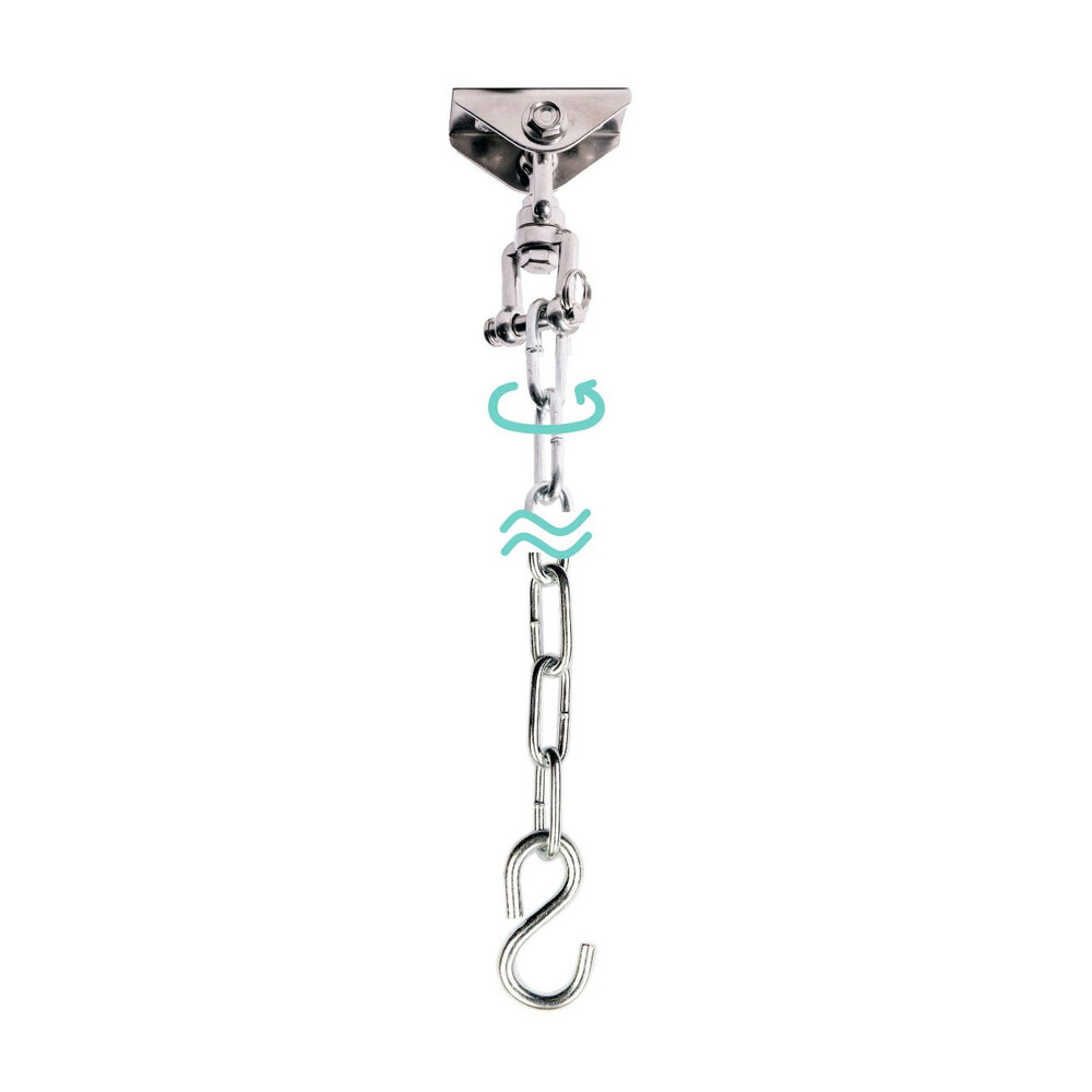 A mennyezethez rögzített talp egy forgószemet is tartalmaz, utána egy karabinerrel kapcsolódik a lánc, aminek az alján egy kampóra akasztható a függőszék.